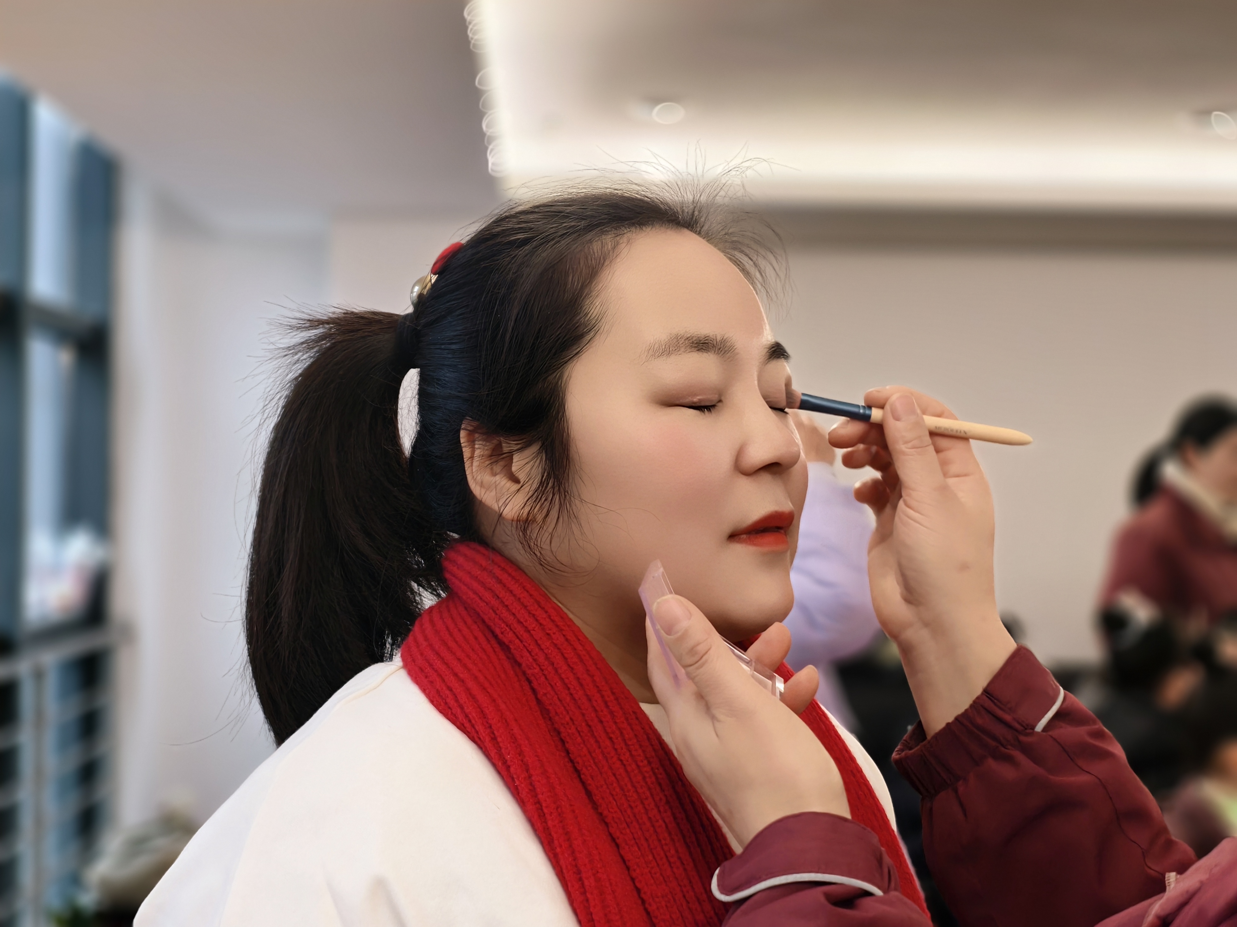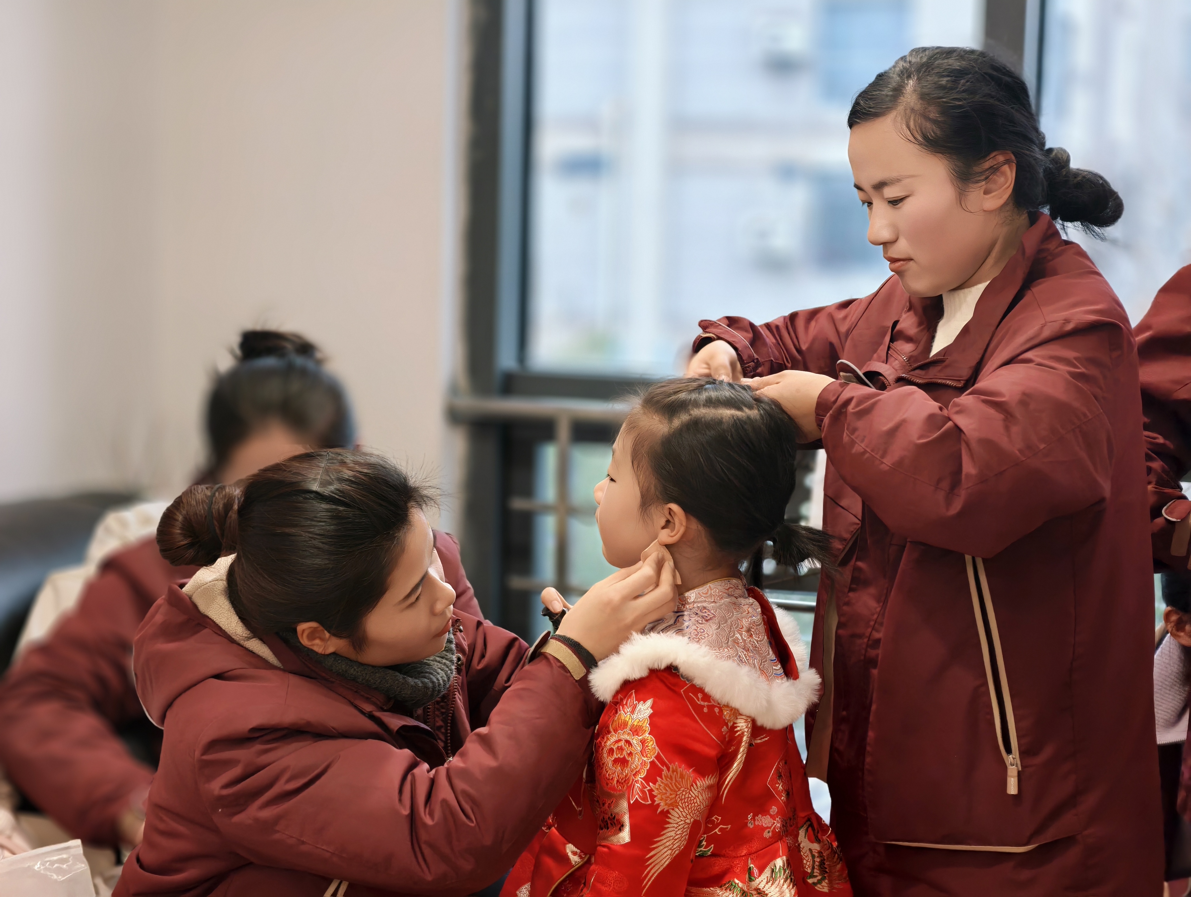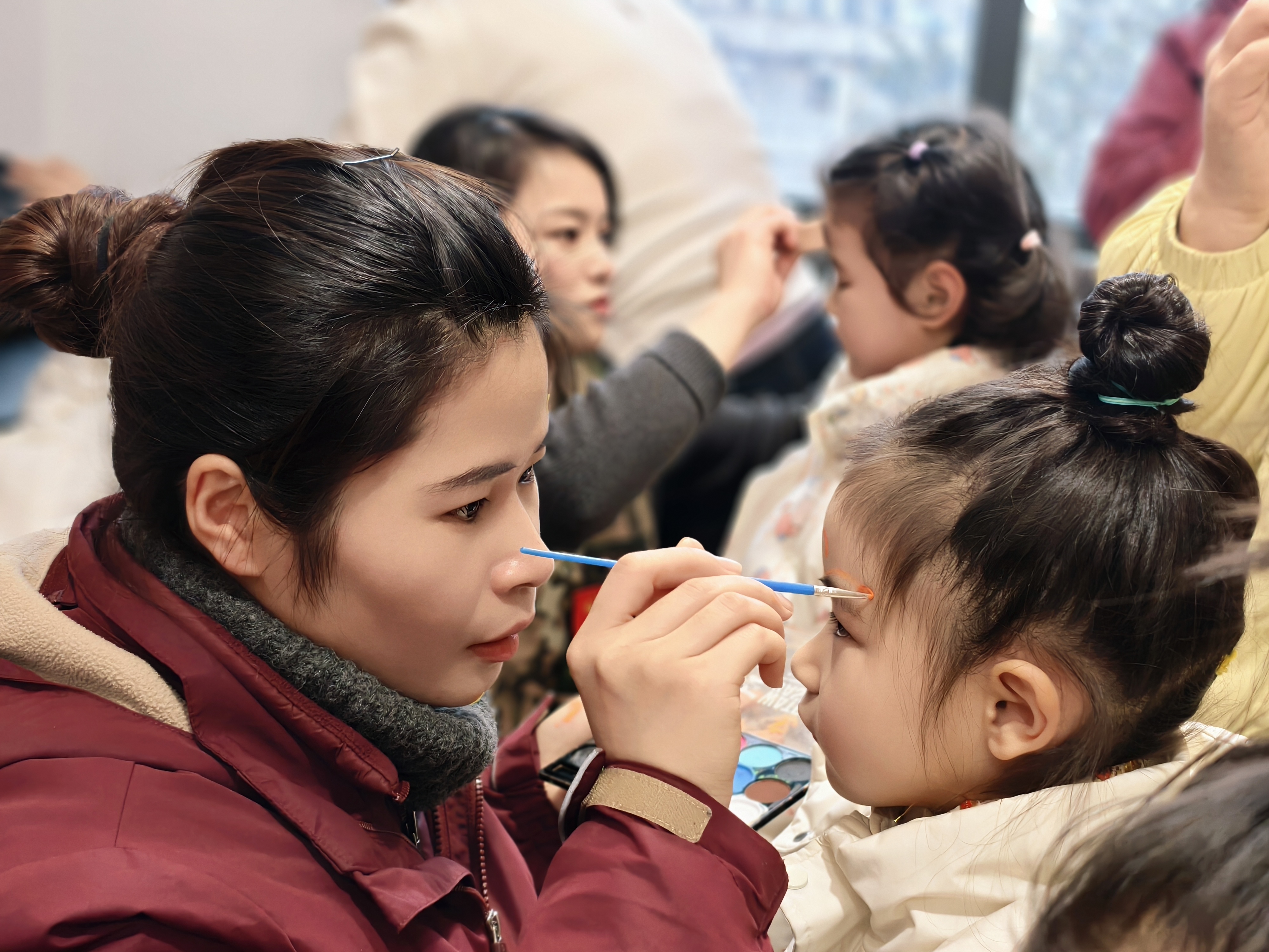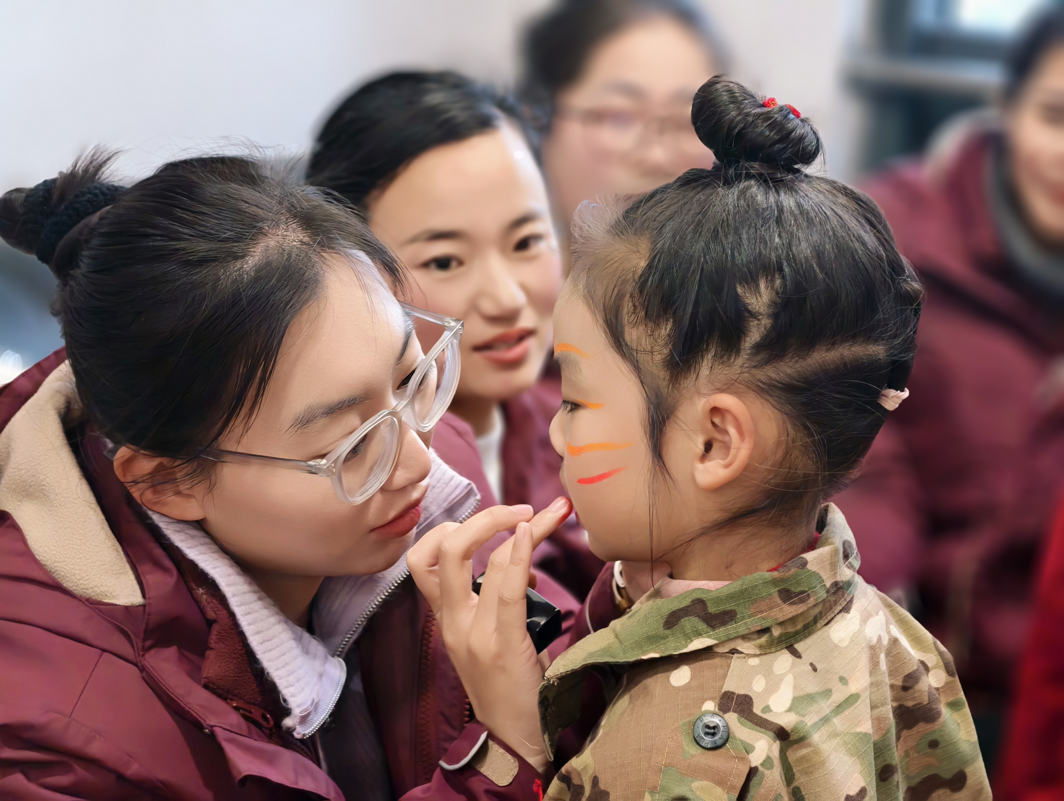 化妆间里,老师与志愿者俯身为孩子整理妆容,乐龄长辈与小朋友并肩对镜微笑;
