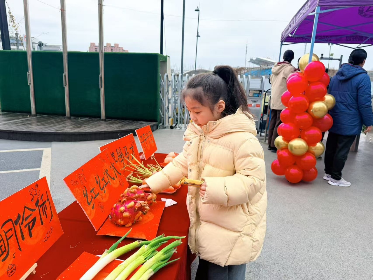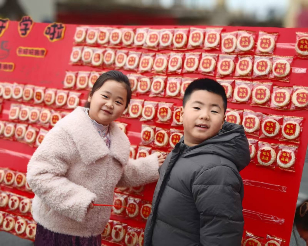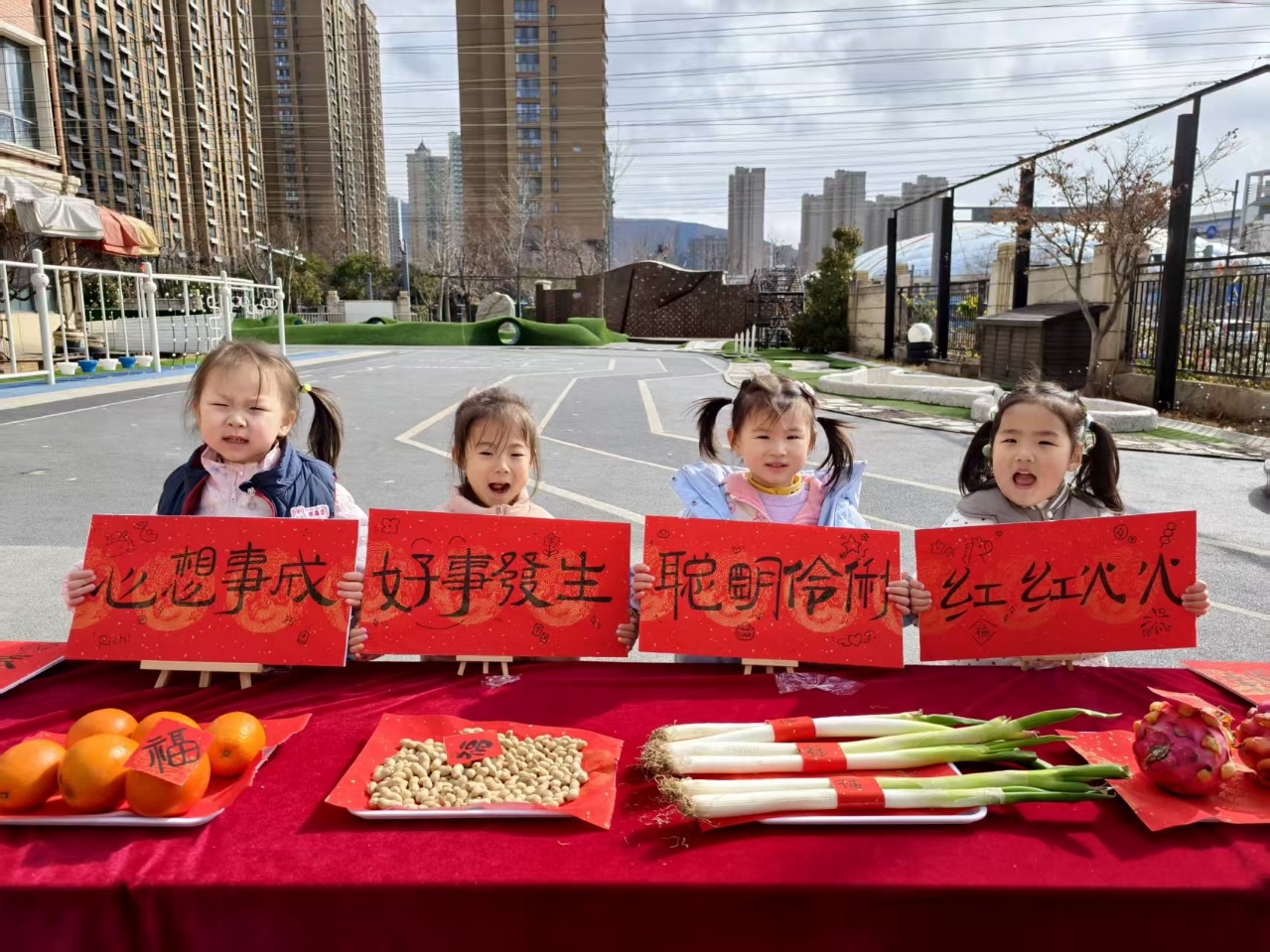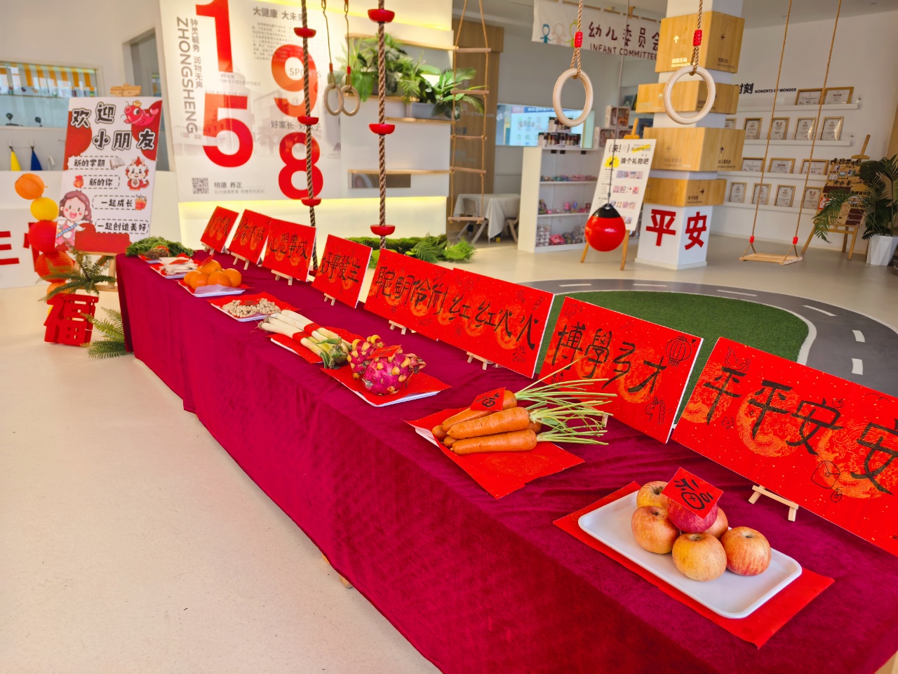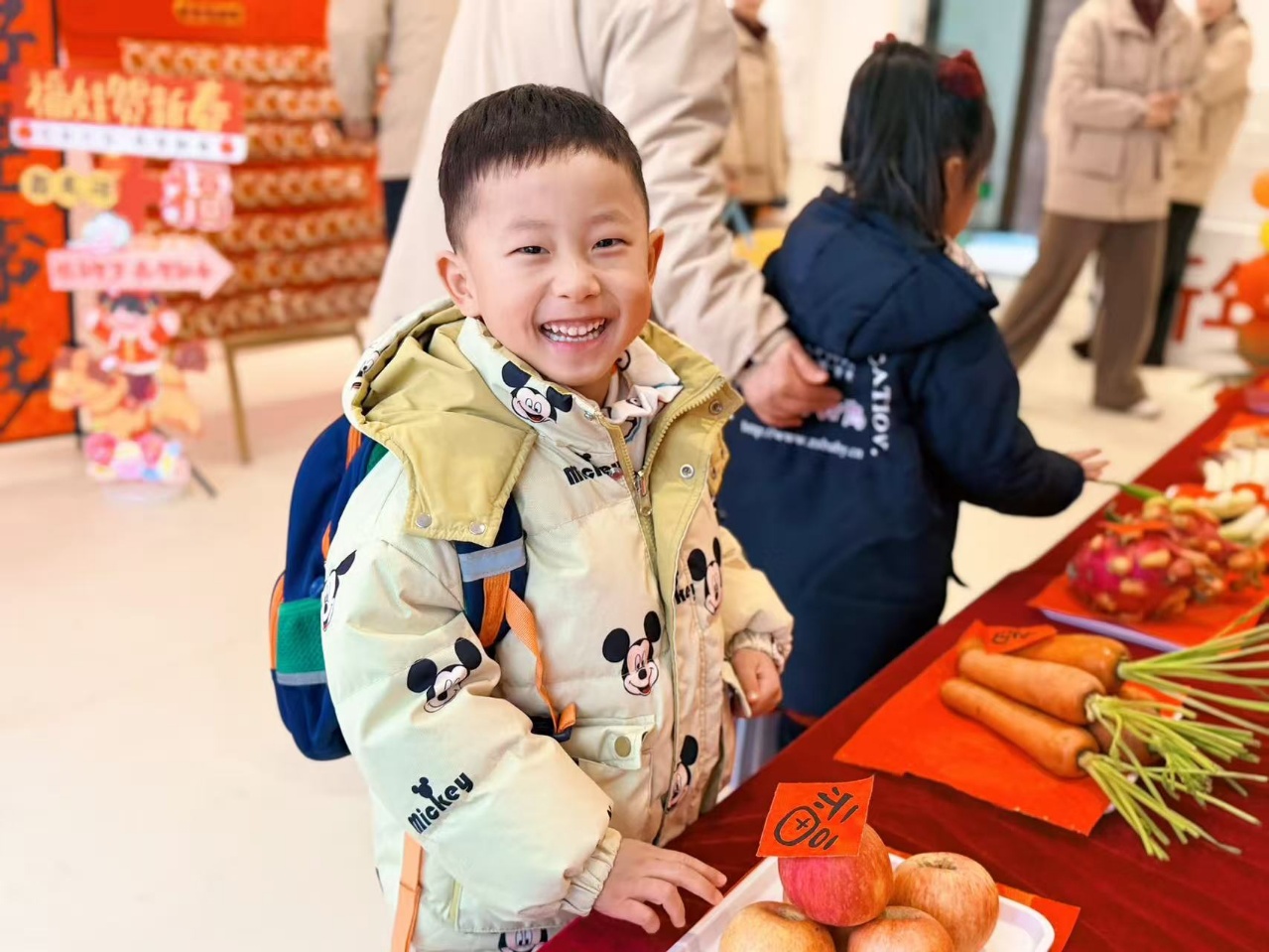 老师们精心布置了祈福摸彩环节:摸苹果平平安安,摸火龙果红红火火,摸橙子心想事成,摸花生生机勃勃,拿旺旺雪饼天天旺旺,每一样都承载着对孩子们满满的祝福。