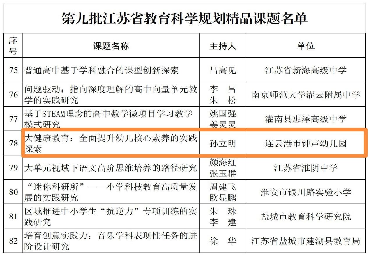 钟声大健康教育研究继2023年立项江苏省教育科学规划重点课题,2024年又被江苏省教育厅列为基础教育前瞻性教学改革实验项目后,再次喜结硕果,被评为第九批江苏省教育科学规划精品课题,并成为连云港市学前教育与义务教育学段此次唯一获此认定的项目。